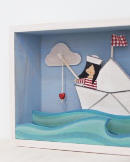 "Un día, Julia cogió su barco de papel en busca de aventuras hacia la isla que veía desde la orilla de la playa" Este diorama de madera que huele a mar es un bonito detalle para colocar en tu casa en cualquier estantería y crear un rincón especial. Una pieza única elaborada en nuestro taller de forma artesanal y con mucho mimo.