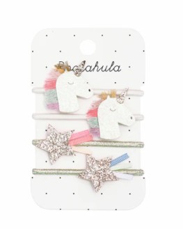 Un set con cuatro coleteros la mar de bonicos. Unos coleteros de unicornios y estrellas que quedarán monísimos en las cabecitas de las peques. La marca Rockahula nos sorprende con un montón de accesorios para el pelo de lo más original que lucirán bien bonitos en los peinados de tu peque.