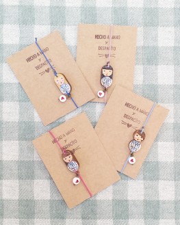 Si te gusta y quieres ver más opciones de color de pelo o color de la bata de las pulseras que ya tenemos hechas, sólo tienes que escribirnos un correo a tienda@marramiau.es. De este modo, efectuarías la compra online recibiendo la pulsera que hubieses elegido más adaptado al parecido de la profe de tus peques.